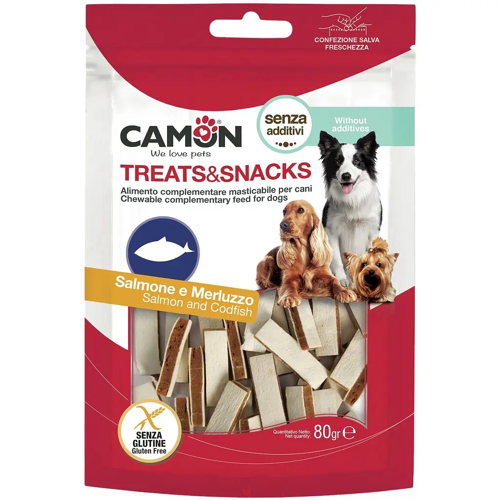 Снек Camon Прямоугольный сэндвич с лососем и треской - идеальное угощение для собак, содержащее высококачественные ингредиенты, богатые природными белками и полезными жирами.