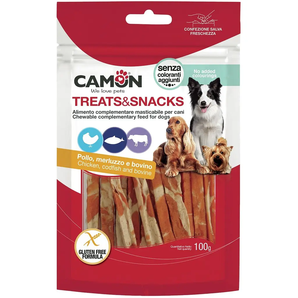 Снек Camon Стрипсы с курицей, треской и говяжьей кожей - это вкусная и полезная добавка к рациону вашего любимца, которая сочетает нежное куриное мясо, питательную треску и крепкую говяжью кожу. Стрипсы идеально подходят для угощения и мотивации вашей собаки.