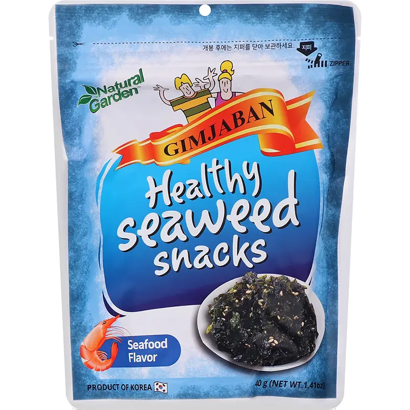 Снеки Natural Garden Gim Jaban зі смаком морепродуктів для любителів морського аромату і присмаку. Не надто солоний насичений смак. Добре смакує до рису, спагетті, консервованого тунця чи як окремий перекус.