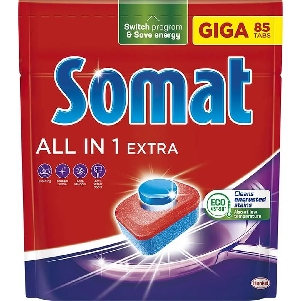 Таблетки для посудомоечной машины Somat «Все в одном Экстра» для чистой и блестящей посуды, предоставляющие мощную очистку от засохших пятен даже при низкой температуре в режиме Eco и на коротких циклах мытья посуды.