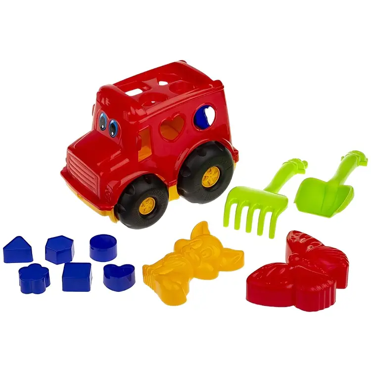 В комплекте: автобус с вкладышами, лопатка, грабельки и две большие пасочки. Упаковка: полимерная сетка.