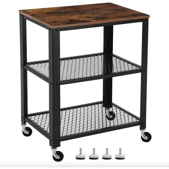 Это идеальный вариант для тех, кто любит постоянно менять расположение мебели или стремится к максимальному удобству. Колеса вращаются на 360 градусов, а с тормозами можно зафиксировать его в любом месте. Для желающих более статической конструкции предусмотрены регулируемые ножки, обеспечивающие стабильность стеллажа даже на неровном полу. Прочная конструкция из качественных материалов Изготовлен из ДСП и металла, этот стеллаж сочетает в себе надежность и эстетичный вид. Столешница из дерева придает ему изящество, а прочные сетчатые полки позволяют стеллаж выдерживать значительные нагрузки. Максимальная нагрузка на верхний стол составляет 80 кг, а каждая полка может выдержать до 40 кг, что делает его практичным для хранения тяжелых предметов, таких как книги, посуда или рабочее оборудование. помещений.