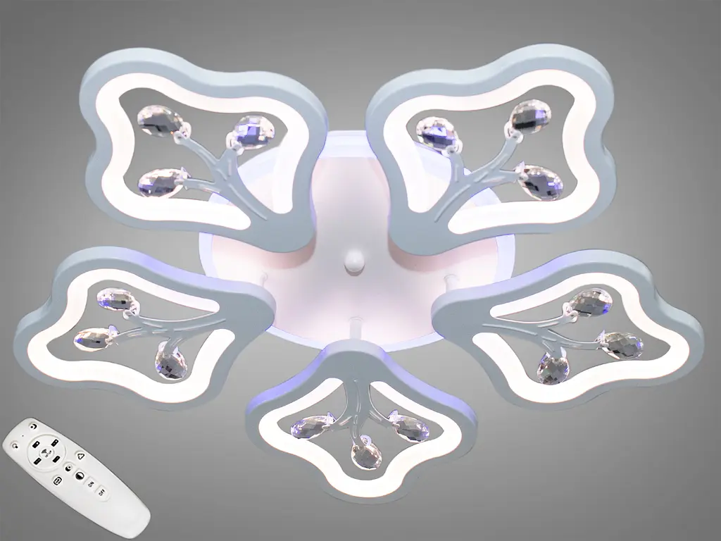 Перед Вами совершенно новое и необычное исполнение плафонов, обрамляющих LED лампы. Такая люстра запросто подойдет под любой интерьер - классический, современный и даже в стиле «хай-тек». В комплекте с люстрой идет самый современный тип пульта с электронным диммером и регулятором цвета. С пульта можно включить один из предустановленных режимов освещения - теплый свет, холодный свет, нейтральный; включить синюю подсветку или режим «ночник» (люстра будет включена всего на 5% мощности LED-люстры), уменьшить или увеличить яркость на 50%, а если всего этого покажется мало — плавно отрегулировать уровень яркости и цветовую температуру. С выключателя люстра переключается как и любая другая светодиодная люстра. Каждое включение-выключение поочередно переводит люстру по следующим режимам: подсветка, холодный свет, теплый свет, нейтральный свет. К привычной диодной подсветке синего цвета добавились нежные оттенки розового и страстные блики красного. Рассеиватель, выполненный из литого акрила, равномерно распределяет свет по помещению. При этом сам светится очень мягко. Вы можете смотреть на включенную люстру и не бояться поймать «зайчиков». Эффект мягкого освещения очень важен в помещениях, где часто находятся дети! Еще одним неоспоримым преимуществом этой светодиодной люстры для детской комнаты является отсутствие стеклянных элементов.