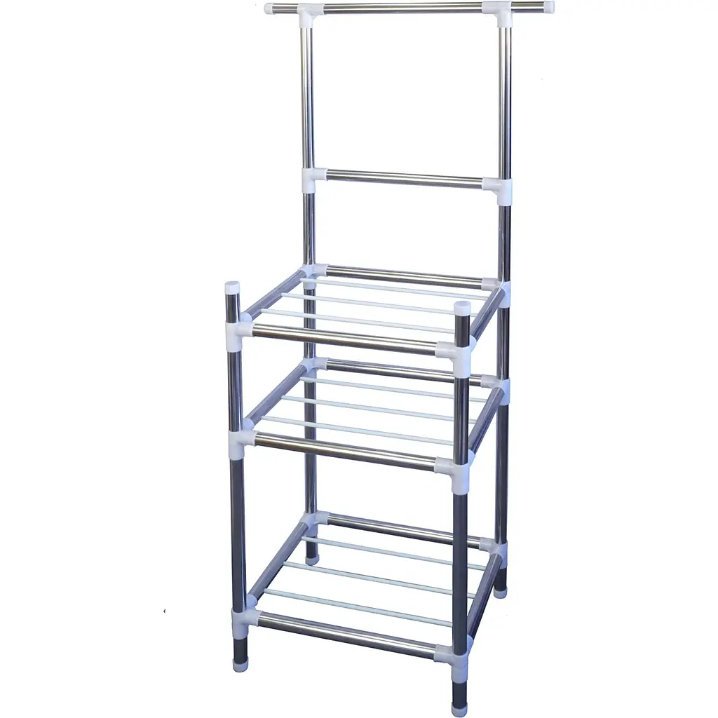 Стойка изготовлена из прочных металлических трубок, которые обеспечат надежное хранение различных вещей. Изделие имеет 3 полочки, на которых вы сможете разместить банные аксессуары, посуду, домашнюю обувь, сложить постельное белье и тому подобное. Вверху стойка имеет две трубы, на которые можно вешать полотенца и другие вещи.