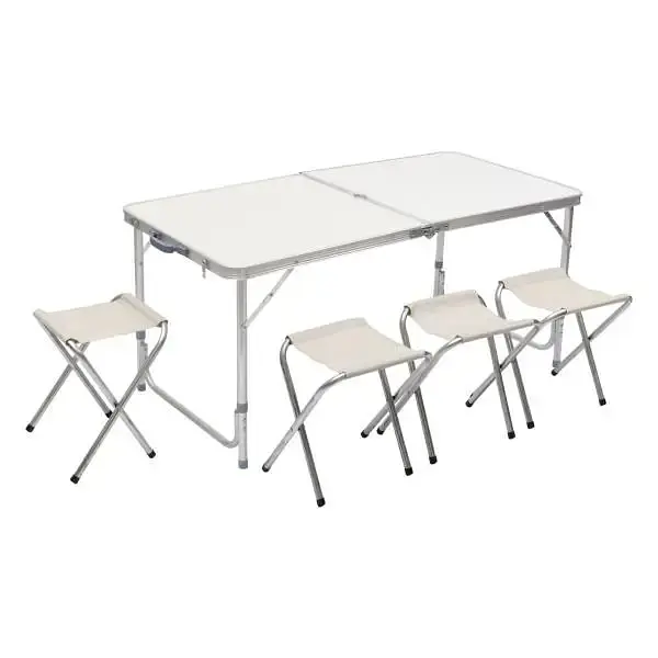Раскладной комплект мебели с алюминиевым каркасом подходит для отдыха на природе, рыбалке, кемпинге или семейных пикниках. Благодаря сложной конструкции мебель компактно трансформируется в чемодан с размерами 60×60×7 см, который удобно хранить и перевозить в багажнике. В комплект входит стол и четыре укладываемых внутрь стула, поэтому все хранится в одном месте.