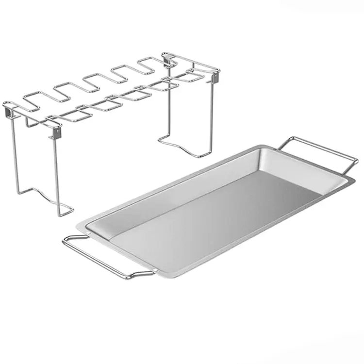 Комплект состоит из стойки и поддона, выполненных из качественной пищевой нержавеющей стали, что гарантирует ему длительный срок эксплуатации. Для удобного хранения подставка складывается и не будет занимать много места. Стойка для куриных ножек, безусловно, будет одним из востребованных вами аксессуаров и поможет приготовить великолепные блюда!