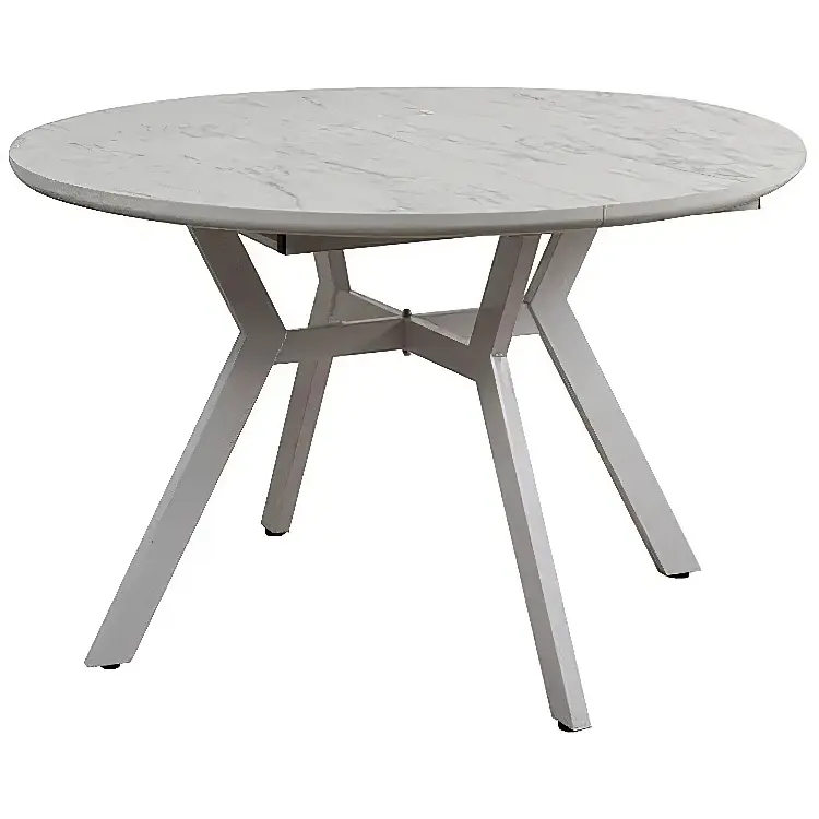 Круглая столешница выполнена из ламинированного МДФ с глянцевой поверхностью, обеспечивающей элегантный и современный вид. Раскладка бабочка позволяет легко увеличить рабочую поверхность стола. Белые металлические ножки придают столу прочность и устойчивость.