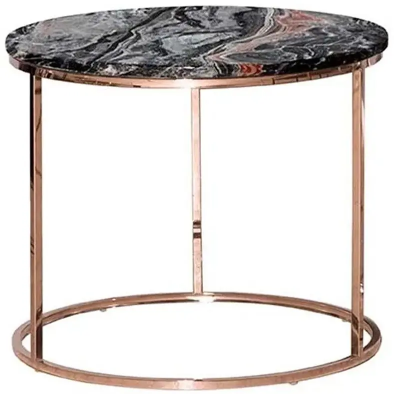 Стильный круглый журнальный столик Глори, сделанный в современном стиле. Столешница изделия - из ламинированного мрамора, покрытого глянцевым лаком, серый с прожилками, имитирующими рисунок камня. Ножки столика выполнены из зеркальной хромированной стали золотистого цвета.