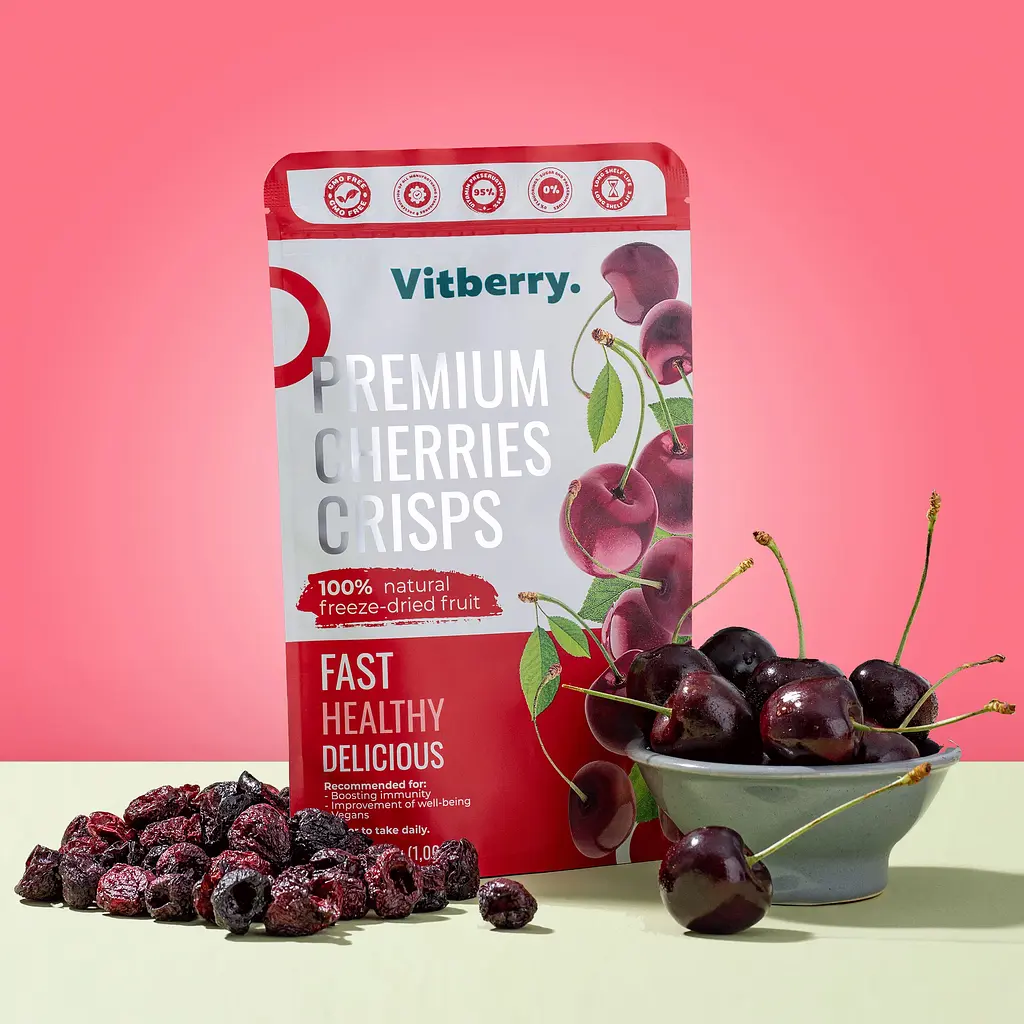 Сублимированная черешня – польза и вкус в каждой ягоде! Благодаря сублимации черешня сохраняет 98% витаминов и минералов, таких как витамин С, А, группы В, калий, магний и железо. Она улучшает иммунитет, поддерживает сердце и нервную систему, а благодаря клетчатке (2 г на 100 г) способствует здоровому пищеварению и обмену веществ. Для поддержания здоровья рекомендуется съедать 25-30 г сублимированной черешни в день — этого достаточно, чтобы обеспечить организм полезными веществами без перегрузки.