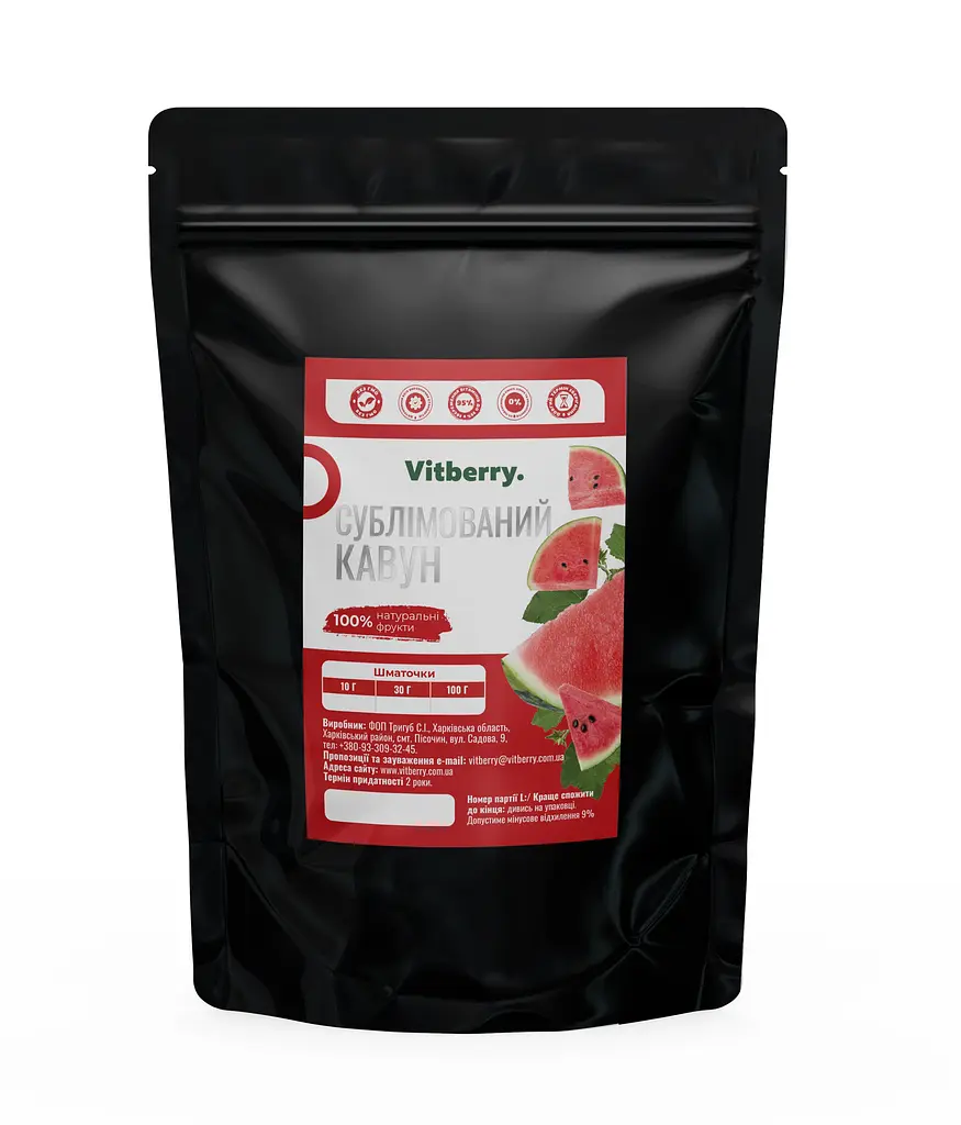 Сублимированный арбуз (слайсы): натуральные чипсы из арбуза без сахараСублимированный арбуз от Vitberry — это концентрированный вкус лета в хрустящем формате. Мы превратили сочную ягоду в полезные чипсы, сохранив 100% сладость без добавления сахара. Это идеальный выбор для тех, кто ищет здоровую альтернативу конфетам или оригинальный ингредиент для напитков и десертов.