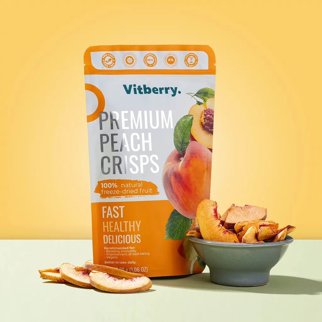 Сублимированный персик – сладкий акцент на каждый день! Персик после сублимации сохраняет витамины А, С, Е, калий и антиоксиданты. Благодаря клетчатке (1,5 г на 100 г) он способствует пищеварению, укрепляет иммунитет и защищает клетки от старения. Рекомендуется употреблять 25-30 г в день. Сублимированный персик легче и полезнее сушеного, не содержит добавленного сахара, а только натуральную сладость.