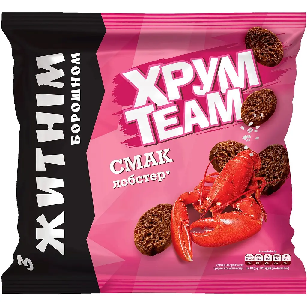 Сухарики ХрумTeam Лобстер з житнім борошном мають насичений морський смак і приємну хрустку текстуру. Житнє борошно додає цікавої нотки і робить їх особливо ароматними. Чудовий варіант для перекусу, який швидко стає улюбленим.