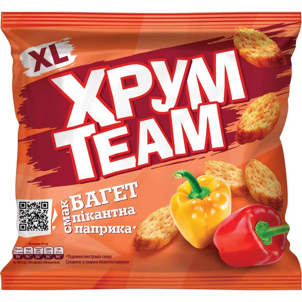Сухарики ХрумTeam Багет зі смаком пікантної паприки мають насичений аромат і приємну хрустку текстуру. Легка гостринка паприки робить їх особливо апетитними та цікавими на смак. Чудовий варіант для перекусу або компанії друзів.
