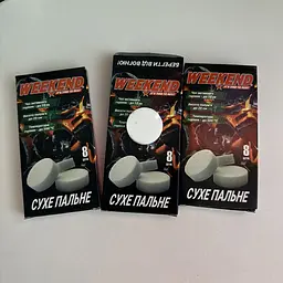 Сухое топливо для разведения огня WEEKEND - это таблетки прессованного сухого горючего, которые горят бесцветным пламенем аналогично спиртам, не растекаются при горении, не коптят и не оставляют золы.