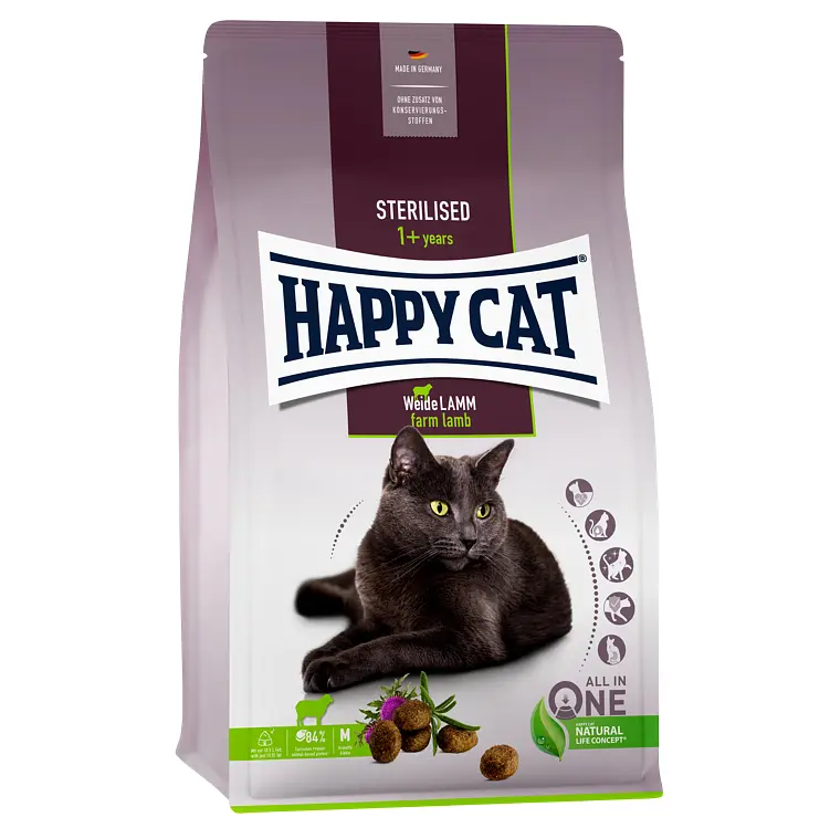 Сухой корм Happy Cat (Хэппи Кэт) Sterilised Weide Lamm разработан для взрослых кошек, склонных к избыточному весу после кастрации или стерилизации, а потому особенно нуждающихся в диетическом питании.