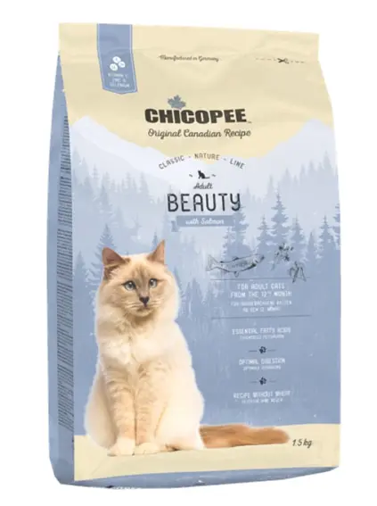 Chicopee CNL Beauty с лососем — полноценное питание для взрослых кошек, способствует улучшению пищеварения, здоровью и долголетию животного.
