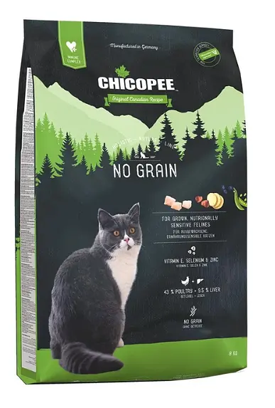 Chicopee HNL No Grain беззерновой — полноценное питание для взрослых кошек, способствующее улучшению пищеварения, здоровья и долголетия животного. Этот корм подходит для домашних кошек и кошек с чувствительным пищеварением.