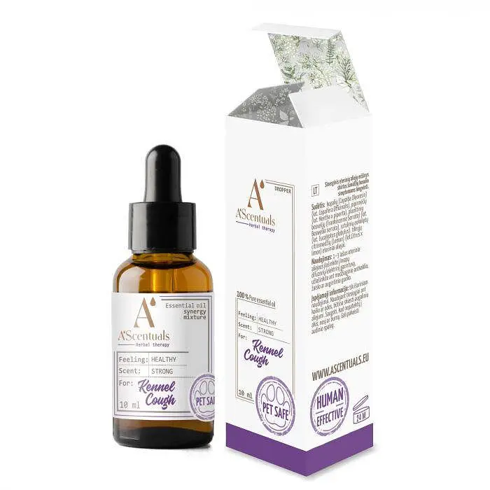 Смесь эфирных масел A’SCENTUALS Kennel Cough предназначена для лечения кашля у собак. Эта смесь натуральных эфирных масел может улучшить дыхательную функцию, убивать бактерии, вирусы и грибки, а также дезинфицировать и очищать воздух в помещении.