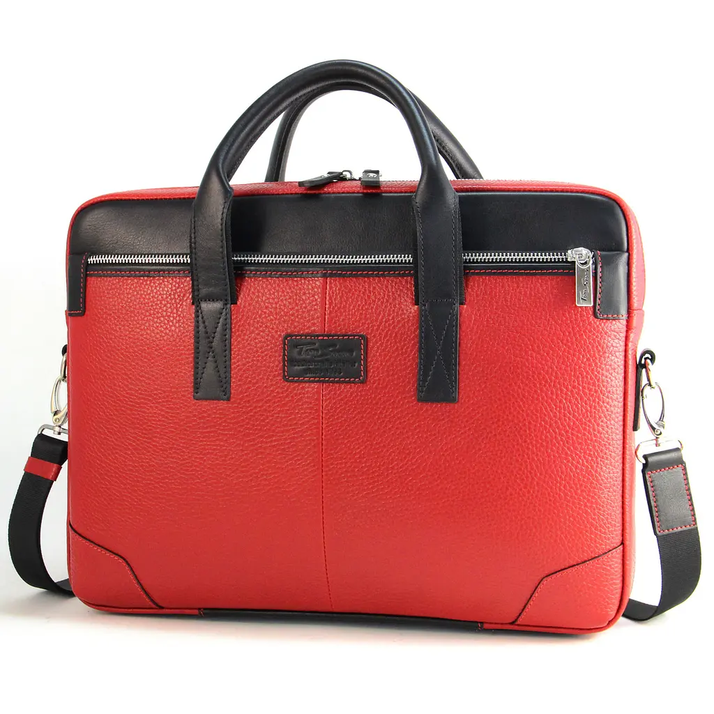 Стильная женская сумка для ноутбука 15,6" или MacBook 16". Изготовлена из натуральной кожи флотар красного цвета и Crazy Horse черного. В переднем кармане - удобный органайзер. Внутри находится специальное отделение для ноутбука, уплотненное листовой пеной 3 мм и большой карман на молнии под документы А4. В переднем и заднем карманах также свободно разместятся бумаги формата А4. Передний карман на молнии, а задний открытый. Ручки укреплены ременной лентой из полиэстера. Дно защищено резиновыми ножками и не будет царапаться. Носить аксессуар удобно в руке или на плече.