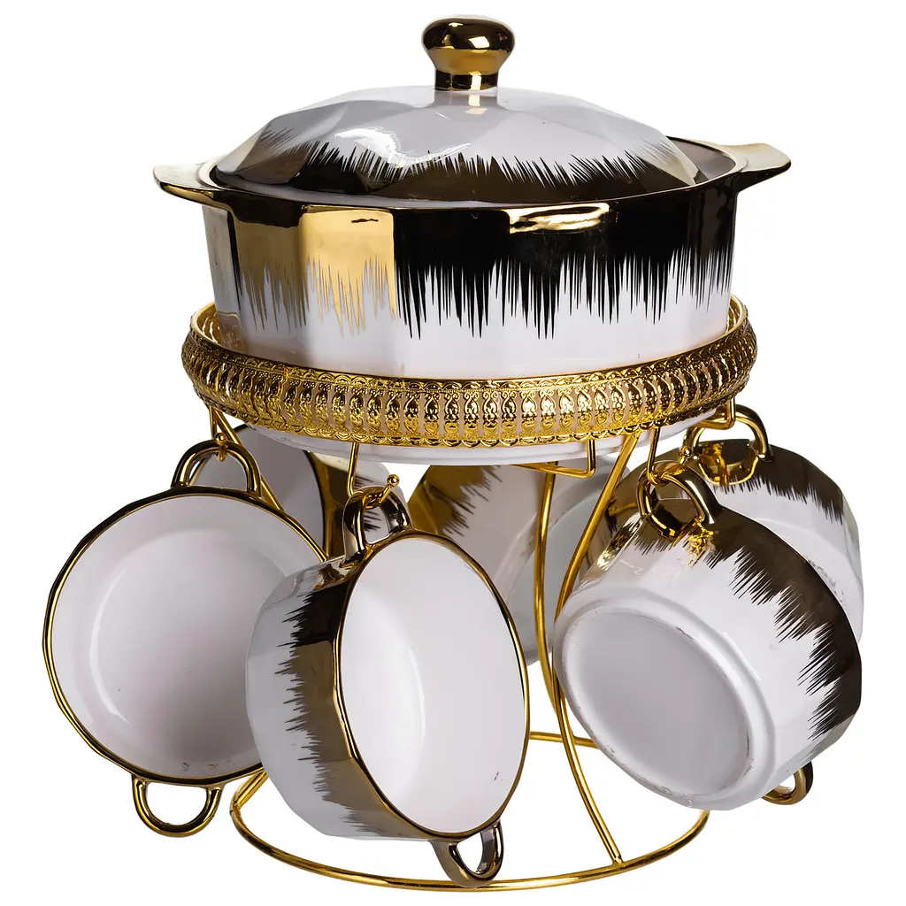 В комплект входит супница с крышкой и шесть суповых тарелок, на крепкой металлической подставке с золотым покрытием. Благодаря удобной форме и продуманному дизайну сервиз не только красив, но и удобен в использовании.