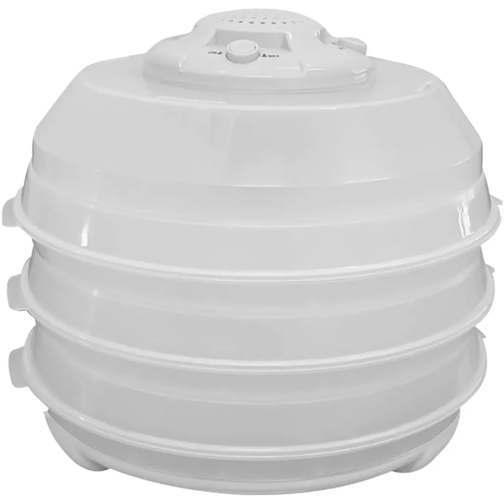 Одновременная сушка нескольких видов продуктов. Модель обладает цилиндрической конструкцией, произведенной из термостойкого белого пластика. Сушилка оснащена 6 наращиваемыми лотками для сушки продуктов. Это дает возможность одновременной сушки нескольких видов продуктов или их большого количества, при этом можете легко менять количество лотков.