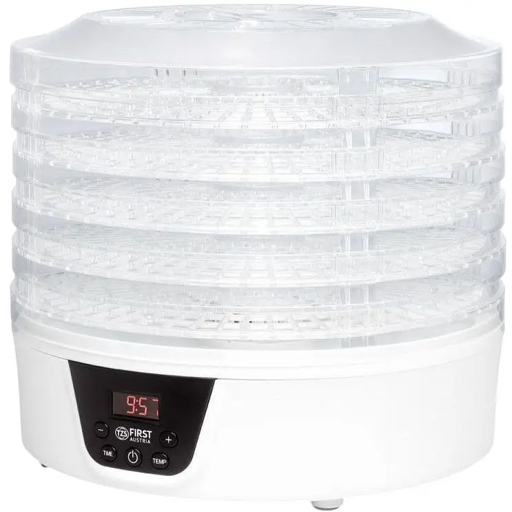 5 пластиковых поддонов диаметром 29.5 см. Выбор высоты слоя 1.3/2.4 см. Цифровой дисплей. Уровень шума не более 45 дБ.