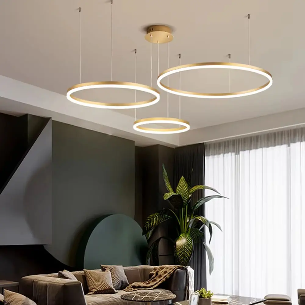 Современная люстра на три кольца в латунном каркасе представлена в двух размерах колец. 80+60+40 см, мощность 140 Вт (70 Вт теплое и холодное) 60+50+40 см, мощность 115 Вт (60 Вт теплый и холодный свет) Люстра имеет три световых режима, которые включаются последовательно: холодный, теплый, нейтральный. Особенностью данной модели есть возможность регулировать высоту и выставлять желаемое положение колец. Они могут размещаться на разной высоте друг относительно друга, создавая свою уникальную световую композицию. Цвет основы: 80 Серия: 9009 Размер потолочной основы: 17х4 см Цветовая температура: 3000K,4500K,6500K Максимальная высота: 125 см Минимальная высота: 20 см Материал основы: Металллл Размер монтажной планки: 10 см Тип крепления: Монтажная планка, 6 металлических тросов Мощность (Вт): 115 w