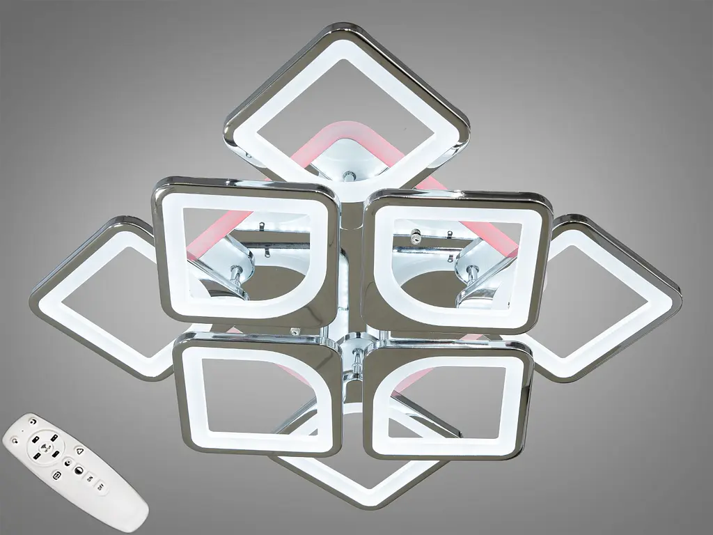 Встречайте самую хитовую модель LED люстры 2024 в хромированном исполнении, лед люстры хромированные, лед люстры с квадратными плафонами! Новая люстра на кухню светодиодная, является современным и функциональным осветительным прибором. LED люстра из серии «Квадраты» состоит из восьми квадратных световых модулей с закругленными углами, выполненных в хромовом цвете, что придает ей изысканность и современность. Это совершенно новое и необычное исполнение плафонов в двух уровнях, обрамляющих LED лампы. Центральный элемент светодиодной люстры Диаша имеет дополнительную светодиодную подсветку разных цветов, по выбору, которая создает теплую атмосферу и может служить ночником или декоративным элементом. Рассеиватель светодиодной люстры Диаша изготовлен из литого акрила и равномерно распределяет свет по помещению. При этом сам светится очень мягко. Вы можете смотреть на включенную люстру и не бояться поймать "зайчиков". Эффект мягкого освещения очень важен в помещениях, где часто находятся дети. LED люстра на пульте оснащена димером, что позволяет регулировать интенсивность света, обеспечивая соответствующую атмосферу для различных ситуаций - от яркого освещения, необходимого для работы или учебы, до приглушенного света для релаксации и отдыха. Включение и регулировка осуществляется с помощью пульта дистанционного управления, что делает использование люстры удобным и интуитивно понятным. Включить с пульта также можно синюю подсветку или режим "ночник" (люстра будет включена всего на 5% мощности LED люстры), уменьшить или увеличить яркость на 50%, а если всего этого покажется мало - плавно отрегулировать уровень яркости и цветовую температуру. Общая мощность LED люстры составляет 130 Вт, что обеспечивает достаточное освещение даже для больших помещений. Светодиоды, используемые в этой люстре, известны своей энергоэффективностью и длительным сроком службы, что делает эту люстру экономически выгодной в длительном использовании. Дизайн люстры идеально подходит для современных интерьеров, которые отличаются чистыми линиями и минималистичными формами, а также для помещений с элементами hi-tech или модерна, где важна функциональность и стиль. Люстра способна стать центральным элементом в дизайне пространства, дополняя интерьер и создавая в нем особую атмосферу.