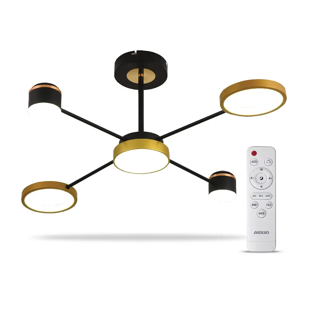 Светодиодная люстра с пультом Ardero AL6120ARD STORIA 41Вт 3000-6500К IP20 Новые модели декоративных SMART светильников с функцией подсветки потолка. Особенности светодиодной люстры Ardero AL6120ARD STORIA Дизайн. Изысканный современный геометрический дизайн со стразами позволяет украсить интерьер домов и квартир, залов ресторанов, кафе, отелей и т.д. Декоративная подсветка потолка. Модели имеют дополнительный режим декоративной подсветки, при котором потолок превращается в настоящее сказочное звездное небо. Высококачественные материалы и комплектующие. Корпус светильников изготовлен из качественного металла, рассеиватель - из прочного акрила Управление светом. Светильники оснащены функцией управления режимами свечения Качественный свет. Коэффициент цветопередачи Ra⩾80 позволяет видеть естественные цвета освещенных предметов. Благодаря правильному расположению светодиодов и качественным компонентам сохраняется однородность свечения светильника без возникновения темных зон. Экономичность. Современный светодиодный светильник, позволяющий сэкономить до 85% электроэнергии по сравнению с использованием обычных люстр. Функция памяти. Последние настройки яркости и цветовой температуры используются при следующем включении светильника. Бренд: Ardero Гарантия: 12 месяцев Тип выключателя: Есть Количество в упаковке: 10 Цвет основания: Черный/золото Цвет свечения: Регулируемый Цветовая температура: 3000-6500К Индекс цвета (RA): Ra≥80 Комплектация: Дистанционный пульт Материал основания: Металл Материал плафона: Пластик Напряжение сети: 230 Мощность (Вт): 41 Размер: 910*745*300 мм Световой поток (Lm): 2964 Класс защиты (IP): IP20 Совместимость с диммерами: нет Срок службы: 25000 часов Тип источника света: LED Тип светильника: Подвесная люстра Возможность диммирования: да Коллекция: STORIA