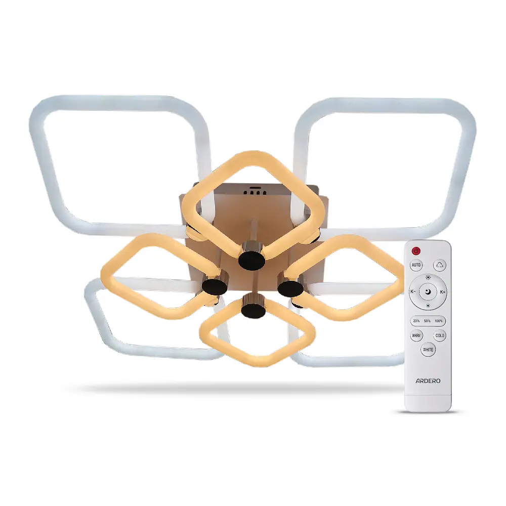 Светодиодная люстра с пультом Ardero AL6138ARD FELICITY 160Вт 2700-6500К IP20 Светильники являются современной, экономичной и экологичной альтернативой обычным люстрам. Благодаря своей универсальности могут использоваться как в жилых, так и в офисных помещениях и коммерческих интерьерах. Особенности светодиодной люстры Ardero AL6138ARD FELICITY Дизайн. Изысканный современный геометрический дизайн со стразами позволяет украсить интерьер домов и квартир, залов ресторанов, кафе, отелей и т.д. Высококачественные материалы и комплектующие. Корпус светильников изготовлен из качественного металла, рассеиватель - из прочного акрила Управление светом. Светильники оснащены функцией управления режимами свечения Качественный свет. Коэффициент цветопередачи Ra⩾80 позволяет видеть естественные цвета освещенных предметов. Благодаря правильному расположению светодиодов и качественным компонентам сохраняется однородность свечения светильника без возникновения темных зон. Экономичность. Современный светодиодный светильник, позволяющий сэкономить до 85% электроэнергии по сравнению с использованием обычных люстр. Функция памяти. Последние настройки яркости и цветовой температуры используются при следующем включении светильника. Бренд: Ardero Гарантия: 12 месяцев Тип выключателя: Есть Количество в упаковке: 10 Цвет основания: Белый/Серебро Цвет свечения: Регулируемый Цветовая температура: 2700-6500К Индекс цвета (RA): Ra≥80 Комплектация: Дистанционный пульт Материал основания: Металл Материал плафона: Акрил Напряжение сети: 230 Мощность (Вт): 160 Размер: 610*610*130 мм Световой поток (Lm): 17170 Класс защиты (IP): IP20 Совместимость с диммерами: нет Срок службы: 25000 часов Тип источника света: LED Тип светильника: Потолочная люстра Форма_люстры: Квадратная Возможность диммирования: да