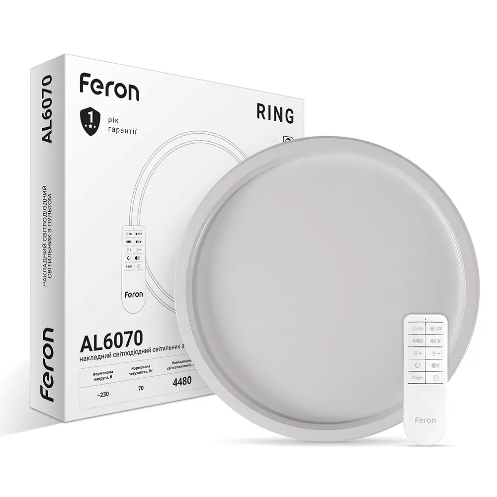 Светодиодная люстра с пультом Feron AL6070 RING 70Вт 3000-6500К IP20 SMART светильник для декоративного освещения. Минималистичный и стильный дизайн позволяет устанавливать такой светильник в домах и квартирах, в залах ресторанов, кафе, отелей и т.д. Особенности светодиодной люстры Feron AL6070 RING Дизайн. Необычное техническое решение и особая конструкция светильника создают эффект зависшего в воздухе светового круга. Экономичность. Современный светодиодный светильник, позволяющий сэкономить до 85% электроэнергии по сравнению с использованием обычных ламп. Равномерное свечение. Равномерное размещение светодиодов по периметру светильника обеспечивает его однородное мягкое свечение без возникновения темных зон. Функция памяти. Последние настройки яркости и цветовой температуры используются при следующем включении светильника. Ресурс работы 25 000 часов Гарантия 12 месяцев Технические характеристики могут меняться в зависимости от партии. Бренд: Feron Гарантия: 12 месяцев Тип выключателя: Есть Количество в упаковке: 1 Цвет основания: Белый Цвет свечения: Регулируемый Цветовая температура: 3000-6500К Индекс цвета (RA): Ra≥80 Комплектация: Дистанционный пульт Материал основания: Металл Материал плафона: Акрил Напряжение сети: 230 Мощность (Вт): 70 Размер: 400*37 мм Световой поток (Lm): 4480 Класс защиты (IP): IP20 Совместимость с диммерами: нет Срок службы: 25000 часов Тип источника света: LED Тип светильника: Потолочная люстра Форма_люстры: Круглая Возможность диммирования: да Коллекция: RING