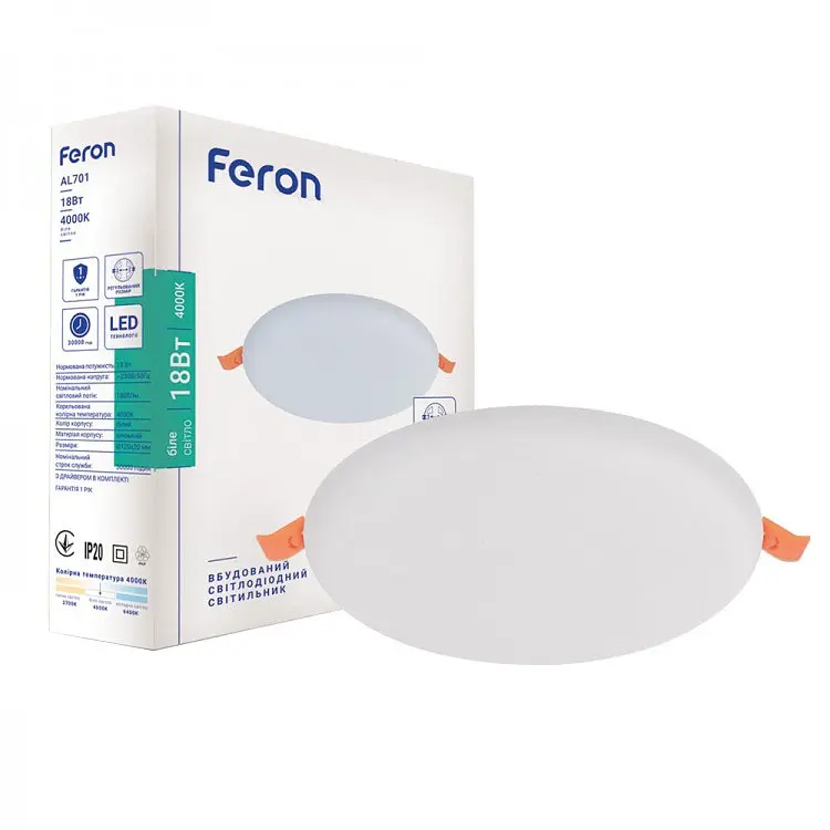 Светильник Feron AL701 отличается безрамочным алюминиевым корпусом и пластиковым рассеивателем, что создает целостный эстетичный вид без лишних элементов. Объемный, но тонкий абажур обеспечивает боковое свечение, увеличивая угол рассеивания света. Благодаря индексу энергоэффективности 100 Лм/Вт и экономии электроэнергии до 90% по сравнению с обычными настольными лампами, светильник является экономичным решением. Качественный драйвер и современная электронная компонентная база гарантируют надежную работу и срок службы до 30 000 часов. Светильник включается мгновенно, обеспечивая комфортное, яркое нейтральное свечение (4000K) без мерцания и бликов с индексом цветопередачи Ra≥80 для естественной цветопередачи. Встроенный механизм регулировки размера обеспечивает удобный монтаж, а степень защиты IP20 позволяет использовать его в сухих помещениях. Модель не совместима с диммерами и не поддерживает функцию диммирования. Перед установкой проверьте целостность светильника и его совместимость с электрической сетью 230 В.