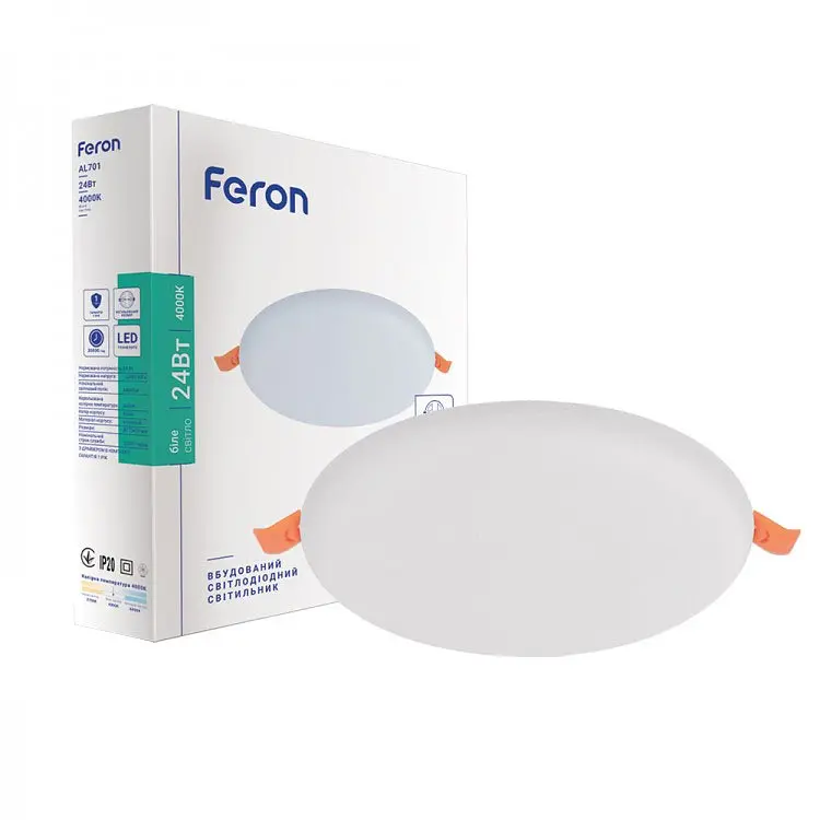 Светильник Feron AL701 отличается безрамочным корпусом из алюминия и пластиковым рассеивателем, что создает целостный эстетичный вид без лишних элементов. Объемный, но тонкий плафон обеспечивает боковое свечение, увеличивая угол рассеяния света. С показателем энергоэффективности 100 Лм/Вт и экономией до 90% электроэнергии по сравнению с обычными настольными лампами светильник является экономичным решением. Качественный драйвер и современные электронные комплектующие гарантируют надежную работу и ресурс до 30 000 часов. Светильник мгновенно включается, обеспечивая комфортное, яркое нейтральное свечение (4000K) без мерцания и блик с коэффициентом цветопередачи Ra≥80 для естественного цветового воспроизведения. Механизм регулировки встроенного размера обеспечивает удобный монтаж, а степень защиты IP20 делает его подходящим для сухих помещений. Модель не совместима с димерами и не поддерживает функцию дымирования. Перед установкой проверьте целостность светильника и совместимость с 230 В.