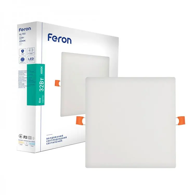 Светильник Feron AL702 отличается безрамочным корпусом из алюминия и пластиковым рассеивателем, что создает целостный эстетичный вид без лишних элементов. Объемный, но тонкий плафон обеспечивает боковое свечение, увеличивая угол рассеяния света. С показателем энергоэффективности 100 Лм/Вт и экономией до 90% электроэнергии по сравнению с обычными настольными лампами светильник является экономичным решением. Качественный драйвер и современные электронные комплектующие гарантируют надежную работу и ресурс до 30 000 часов. Светильник мгновенно включается, обеспечивая комфортное, яркое нейтральное свечение (4000K) без мерцания и блик с коэффициентом цветопередачи Ra≥80 для естественного цветового воспроизведения. Механизм регулировки встроенного размера обеспечивает удобный монтаж, а степень защиты IP20 делает его подходящим для сухих помещений. Модель не совместима с димерами и не поддерживает функцию дымирования. Перед установкой проверьте целостность светильника и совместимость с 230 В.
