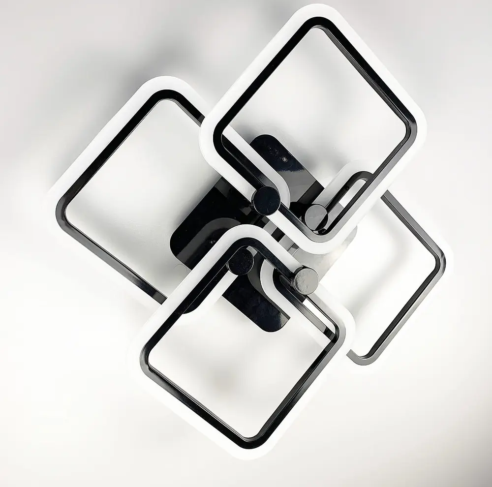 Светодиодная LED люстра на 4 рожках квадратной формы с цветной RGB подсветкой на основе Модель доступна в 3-х цветах корпуса: Белый/Черный/Хром 4 основных режима работы: теплый, холодный, нейтральный, режим ночника Рекомендуем на площадь до 22-25 м Кв Тип выключателя: 12 Серия: 2503 BK Цвет основания: Черный Материал плафона: Акрил Размер упаковки: Вес (кг): 1,8 Цветовая температура: 3000–4500–6000К Материал основания: Металл Размер монтажной планки: 18 см Тип крепления: Монтажная планка Мощность (Вт): 43