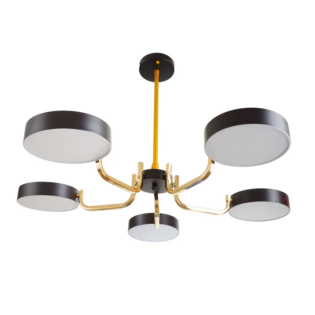 Светодиодная люстра BL-751S/5 WW+CW 35W*2 - это современный модный светильник со стильным дизайном черного и золотистого цвета. Модель подойдет для спальни, гостиной, прихожей или холла. Имеет конструкцию, состоящую из пяти цилиндрических плафонов, прикрепленных к держателям, которые другим своим концом соединены с основанием люстры. Светильник крепится к потолку с помощью монтажной планки. В плафонах расположены встроенные светодиоды общей мощностью 70 Вт. Светодиодная люстра может обеспечивать теплую или холодную температуру свечения. Светодиоды генерируют световой поток с отдачей до 75 лм/Вт. ЛЕД источники очень экономичны и имеют длительный срок эксплуатации. Люстра создает мощный световой поток с высоким индексом цветопередачи (> 80Ra). Дизайн люстры делает модель подходящей для интерьеров, оформленных в разных стилях. Габариты светильника 800*480 мм.