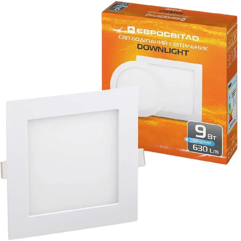 Яркий светильник точечный врезной Євросвітло 9Вт квадрат LED-S-150-9 6400К выбирают для освещения коридоров, санузлов и других небольших помещений. Уютный мягкий свет не напрягает глаза, а отсутствие контрастных теней визуально расширяет пространство.