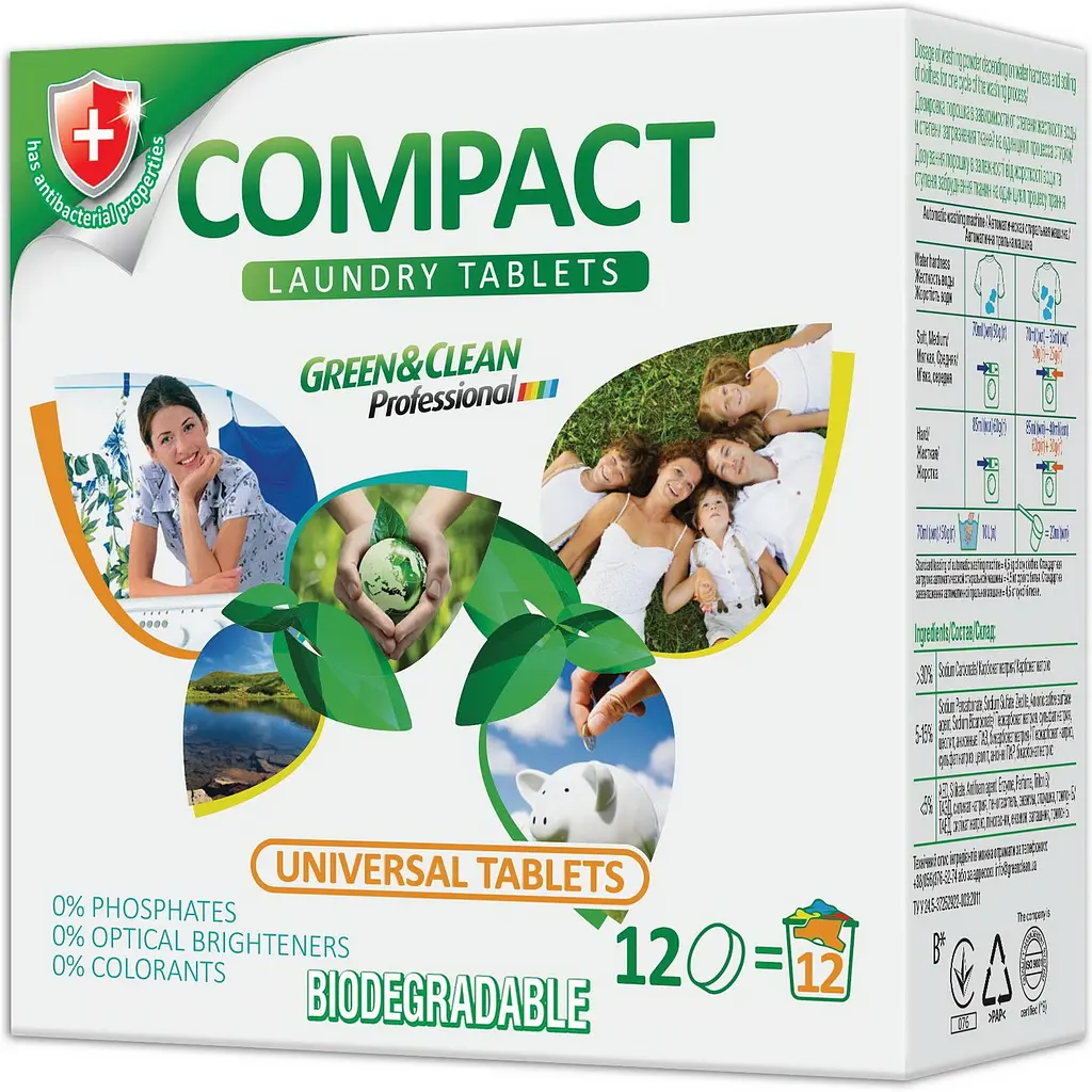 Таблетки для стирки Green & Clean Professional Compact универсальные имеют качественный состав, инновационную формулу, которая позволяет экономить без ущерба качеству. Это лучшее решение для ежедневной стирки, благодаря использованию эффективных компонентов, которые позволили снизить расход до 50 грамм на стандартную стирку (1 таблетка).