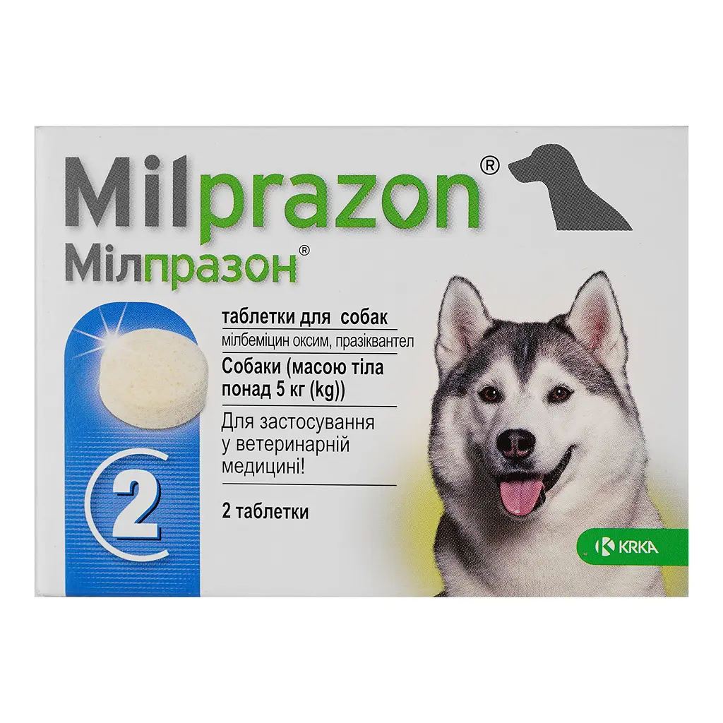 Таблетки для собак с массой тела 5-25 кг KRKA Милпразон широкого спектра действия против кишечных, а также сердечных, легочных и глазных гельминтов.