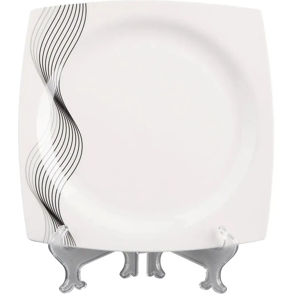 Тарелка десертная, сторона - 20 см. Изготовлена из фарфора. Этот материал считается одним из лучших для изготовления столовой посуды. Он чрезвычайно тонкий и легкий, предметы даже просвечиваются на свет. Благодаря повышенной плотности материала изделия из фарфора достаточно прочные. Эта тарелка выполнена в современном стиле с элементами hi-tech. Она почти правильной прямоугольной формы, слегка выпуклая. Тарелка украшена декоративными волнистыми полосами черного цвета, этот рисунок расположен в стороне от центра тарелки, таким образом создается ощущение асимметричности.