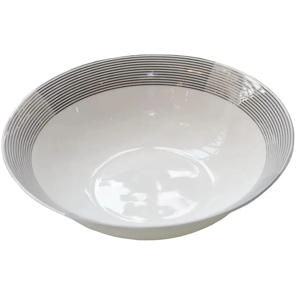 Глубокая тарелка NP119/23 Виолетта изготовлена из высококачественного костяного фарфора. В его состав входит костная мука, поэтому материал получил такое название. Изделия из костяного фарфора обжигают дважды: на этапе создания и после нанесения глазури и росписи. Благодаря этому посуда получается тонкостенной и прочной. Декор тарелки прост, но в то же время отличается особой изысканностью. Это линейный орнамент: по белому полю идут темные линии. Окантовка разделена на четыре сектора, каждый сектор имеет свой оттенок. Тарелку можно мыть в посудомоечной машине на деликатном режиме. Чтобы изделие долго сохраняло безупречный внешний вид, его не следует тереть губками из грубого материала и использовать для мытья абразивные средства. Тарелка очень вместительная, ее диаметр - 23 см, высота - 6,7 см, подойдет для кафе, ресторанов и домашнего использования.