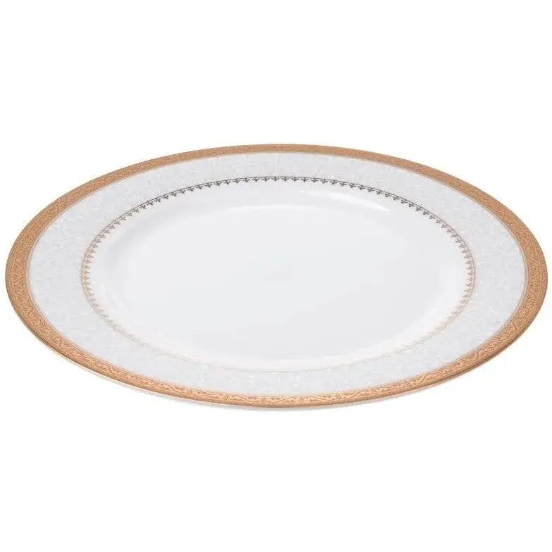 Обеденная тарелка - один из самых необходимых предметов на столе. Она предназначена для подачи основных блюд. Тарелка Фемида сделана из костяного фарфора - материала, который отличается химической и термической стойкостью, тонкостью и белоснежным цветом. Она декорирована красивым узором золотистого цвета и подходит для сервировки праздничного стола. Обеденная тарелка является частью столового сервиза, в который также входят глубокие и десертные тарелки. Такая посуда станет отличным подарком на фарфоровую свадьбу.