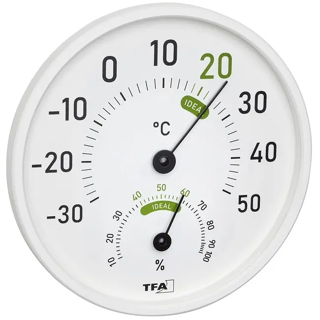 Производитель: TFA Dostmann GmbH & Co.KG, ГерманияОсобенности:Для комнатного или уличного использования Для контроля температуры и влажности в помещении Для здорового климата в помещении Биметаллическая технология Маркировка цветных зон комфорта Стеклянная крышка Не требует батареек Настенная или настольная установка Зарегистрированный дизайн TFA Чувствуем ли мы себя хорошо и комфортно дома, во многом зависит от качества воздуха в помещении. Очень важно контролировать влажность и температуру воздуха в помещении, поскольку слишком влажный воздух в помещении способствует появлению опасной плесени; но слишком сухой воздух в помещении может негативно повлиять на наше самочувствие в нескольких аспектах: кожа и дыхательная система могут пострадать и подвергнуться воздействию инфекций, могут появиться аллергия и симптомы астмы. Домашние животные, растения, деревянные полы, антикварная мебель, музыкальные инструменты и книги также нуждаются в надлежащих климатических условиях. Этот термогигрометр является идеальным прибором для мониторинга климата в помещении или на улице. Вы можете легко следить за температурой и влажностью в помещении и регулировать их с помощью целевого отопления и вентиляции, когда показатели выходят за пределы указанных уровней комфорта. Так вы создадите приятную и здоровую среду обитания и даже сэкономите на расходах на отопление. Механизм гигрометра состоит из биметаллической катушки с покрытием, которая вращается вокруг металлической проволоки. Температура измеряется с помощью проверенной биметаллической технологии.