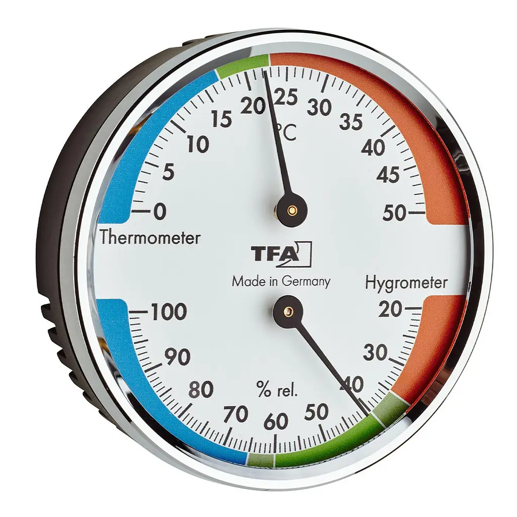 Производитель: TFA Dostmann GmbH & Co.KG, ГерманияОсобенности:Произведено в Германии Для контроля температуры и влажности в помещении Для здорового климата в помещении Биметаллическая технология измерения Цветная маркировка зон комфорта Корпус с рамкой из хромированной латуни Не требует батареек Зарегистрированный дизайн TFA Гарантия 3 года Чувствуем ли мы себя хорошо и комфортно дома, во многом зависит от качества воздуха в помещении. Очень важно контролировать влажность и температуру воздуха в помещении, поскольку слишком влажный воздух в помещении способствует появлению опасной плесени; но слишком сухой воздух в помещении может негативно повлиять на наше самочувствие в нескольких аспектах: кожа и дыхательная система могут пострадать и подвергнуться воздействию инфекций, могут появиться аллергия и симптомы астмы. Домашние животные, растения, деревянные полы, антикварная мебель, музыкальные инструменты и книги также нуждаются в надлежащих климатических условиях. Этот компактный термогигрометр с рамкой из хромированной латуни является идеальным прибором для мониторинга климата в помещении. Вы можете легко следить за температурой и влажностью и регулировать их с помощью целевого отопления и вентиляции, когда значения выходят за пределы уровней комфорта с цветной маркировкой. Так вы создадите приятную и здоровую среду обитания и даже сэкономите на расходах на отопление. Механизм гигрометра состоит из биметаллической катушки с покрытием, которая вращается вокруг металлической проволоки. Температура измеряется с помощью проверенной биметаллической технологии. Термогигрометр полностью изготовлен в Германии. Основным элементом TFA является собственное производство механических метеорологических приборов. TFA создает продукцию, соответствующую маркировке «Сделано в Германии», с использованием самых современных технологий производства и традиционного ремесленного мастерства. Продукция от TFA убеждает своей функциональностью и дизайном.