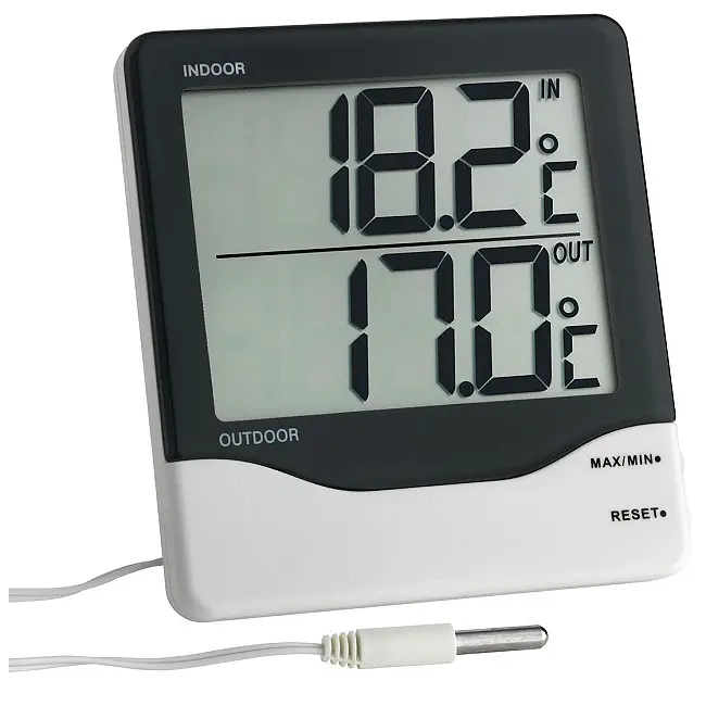Производитель: TFA Dostmann GmbH & Co.KG, Германия Особенности: Отображение температуры внутри и снаружи помещений Измерение температуры наружного воздуха с помощью проводного датчика (около 3 м) Также для мониторинга температуры в морозильной камере/аквариуме Макс.-мин. значения Очень большой дисплей Батарейка в комплекте Этот функциональный термометр идеально подходит для одновременного измерения внутренней и внешней температуры. Благодаря большому дисплею значения особенно легко читаются. Контроль температуры в помещении является важным фактором для комфортной и здоровой среды обитания и помогает экономить энергию. Даже снижение температуры на 1 градус приведет к снижению расходов на отопление на 6%. Размещенный у окна, проводной датчик легко выводится наружу для измерения температуры наружного воздуха. Макс.-мин. память с функцией ручного сброса позволяет наблюдать пиковые значения в течение выбранного периода времени. Возможности применения термометров с проводными датчиками разнообразны и не ограничиваются только измерением температуры наружного воздуха. Благодаря большому диапазону измерений, водонепроницаемый измерительный датчик также можно использовать для контроля температуры холодильника и морозильной камеры или для измерения температуры воды в аквариуме.