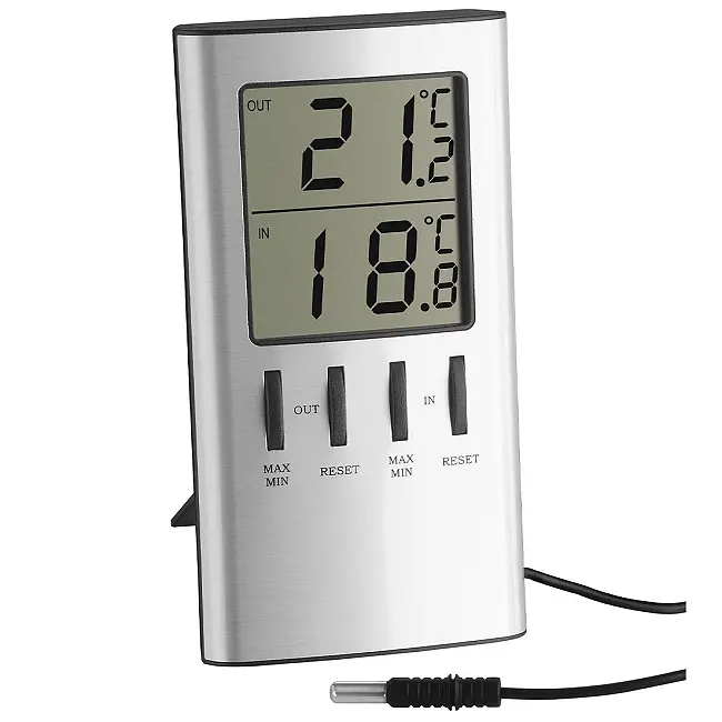 Производитель: TFA Dostmann GmbH & Co.KG, Германия Особенности: Индикация температуры внутри и снаружи помещений Измерение температуры наружного воздуха с помощью проводного датчика (около 300 см) Также для мониторинга температуры в морозильной камере/аквариуме Макс.-мин. значения Корпус серебристого цвета Батарейка в комплекте Зарегистрированный дизайн TFA Этот термометр с серебристым корпусом идеально подходит для одновременного измерения внутренней и внешней температуры. Контроль температуры в помещении является важным фактором для комфортной и здоровой среды обитания и помогает экономить энергию. Даже снижение температуры на 1 градус приведет к снижению расходов на отопление на 6%. Размещенный у окна, проводной датчик легко выводится наружу для измерения температуры наружного воздуха. Макс.-мин. память с функцией ручного сброса позволяет наблюдать пиковые значения в течение выбранного периода времени. Возможности применения термометров с проводными датчиками разнообразны и не ограничиваются только измерением температуры наружного воздуха. Благодаря большому диапазону измерений, водонепроницаемый измерительный датчик также можно использовать для контроля температуры холодильника и морозильной камеры или для измерения температуры воды в аквариуме.