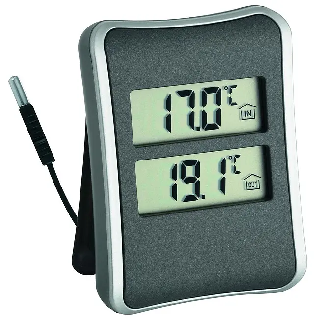 Производитель: TFA Dostmann GmbH & Co.KG, Germany Особенности: Привлекательный, декоративный дизайн. Индикация температуры внутри и снаружи помещений. Измерение температуры наружного воздуха с помощью проводного датчика (около 150 см). Также для мониторинга температуры в морозильной камере/аквариуме. Макс.-мин. значение. Зарегистрированный дизайн TFA Этот декоративный термометр измеряет температуру воздуха внутри и снаружи одновременно. Контроль температуры в помещении является важным фактором для комфортной и здоровой жизненной среды и помогает экономить энергию. Даже понижение температуры на 1 градус приведет к понижению расходов на отопление на 6%. Проводящий датчик можно просто вывести наружу для измерения температуры наружного воздуха. Макс.-мин. память с функцией ручного сброса позволяет наблюдать пиковые значения в течение выбранного периода времени. Возможности применения термометров с проводными датчиками разнообразны и не ограничиваются измерением температуры наружного воздуха. Благодаря большому диапазону измерений, водонепроницаемый измерительный датчик можно использовать для контроля температуры холодильника и морозильной камеры или для измерения температуры воды в аквариуме.
