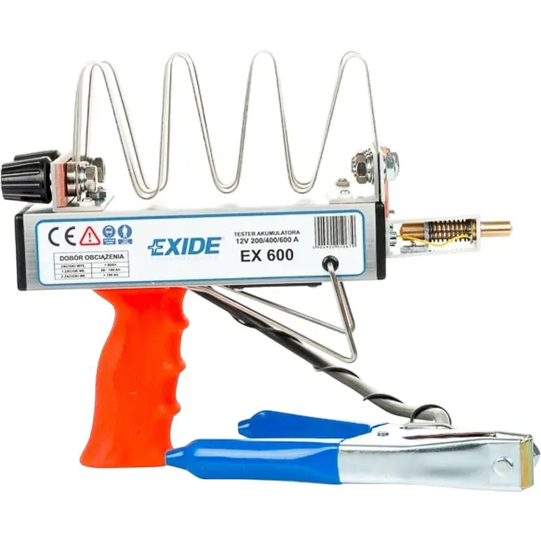 Тестер аккумулятора Exide EX600 предназначен для быстрой оценки пусковых, свинцово-кислотных аккумуляторов номинальным напряжением 6 – 12 В, номинальной емкостью от 30Aч до 230Aч. Тестирование батареи основано на измерении напряжения холостого хода и напряжении под выбранной нагрузкой. Устройство позволяет проверять батарею в трех диапазонах: 200, 400 или 600 А для аккумуляторов 12 В или 100, 200 и 300 А для аккумуляторов 6 В.
