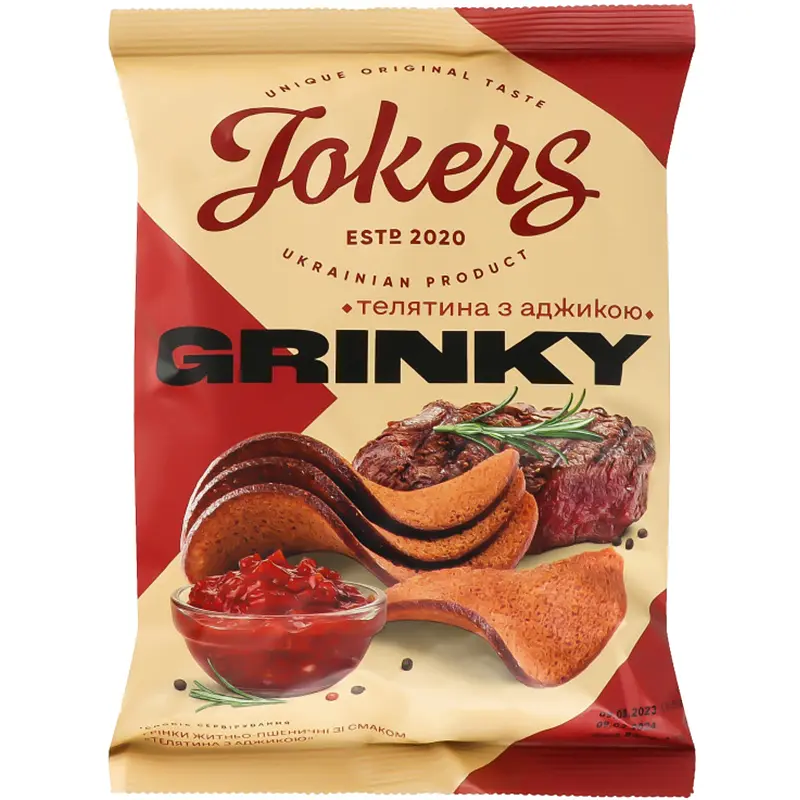 Гренки Jokers ржано-пшеничные со вкусом телятина с аджикой - популярный украинский продукт, сочетающий в себе хрусткость хлеба и любимый вкус.