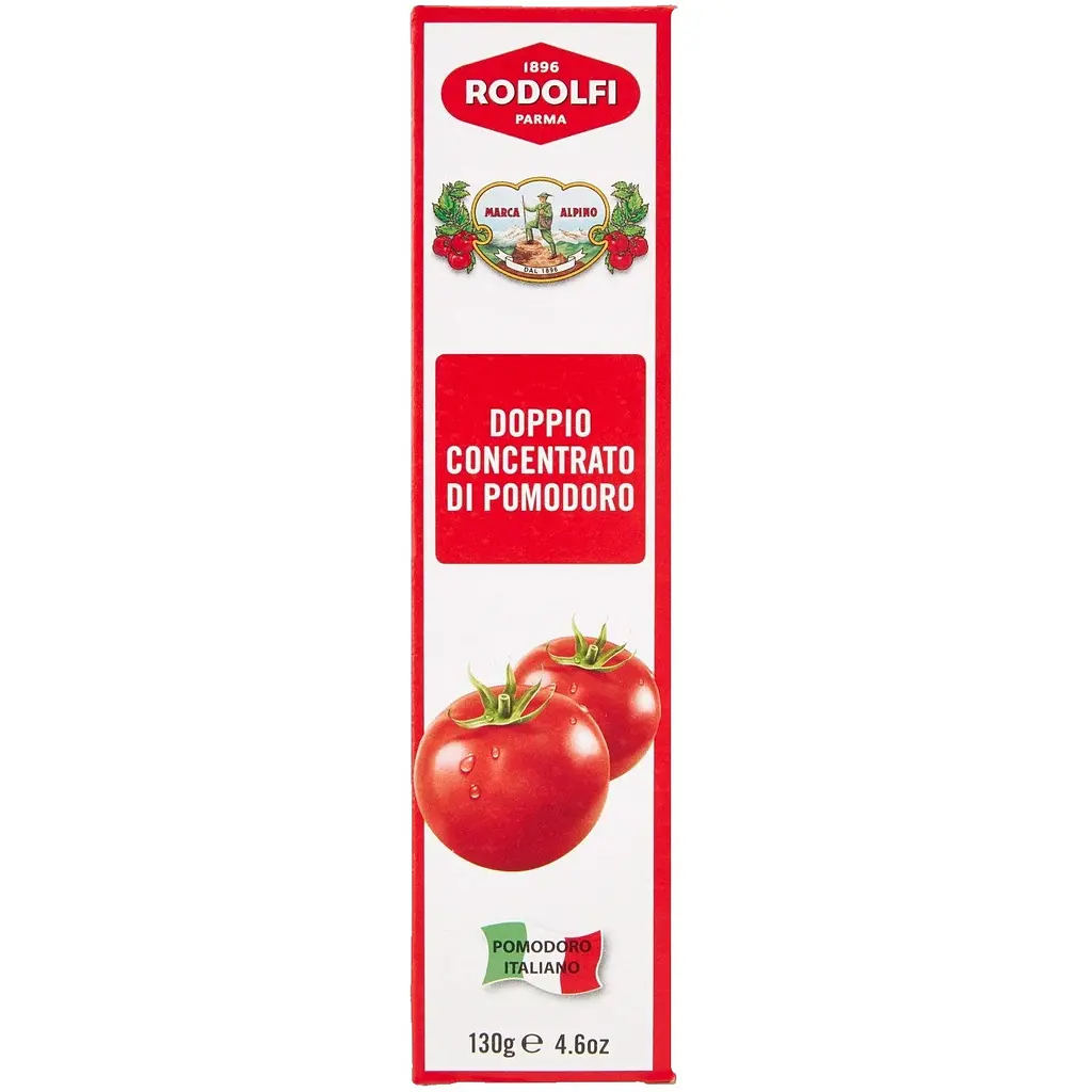 Самая известная томатная паста в тюбике по простому, но очень вкусному рецепту, приготовленная только из 100% итальянских помидоров Rodolfi Alpino. Из 6 кг свежих первоклассных помидоров готовят 1 кг томатной пасты.